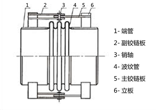 該補償器(qì)由一個(gè)波紋管及銷軸、鉸鏈闆和(hé)主闆等結構件組成,隻能吸收一個(gè) 平面內(nèi)的角位移并能承受波紋管壓力、推力。吸收位移時(shí)應有(yǒu)兩個(gè)或者三個(gè) 角向膨脹節組合使用。