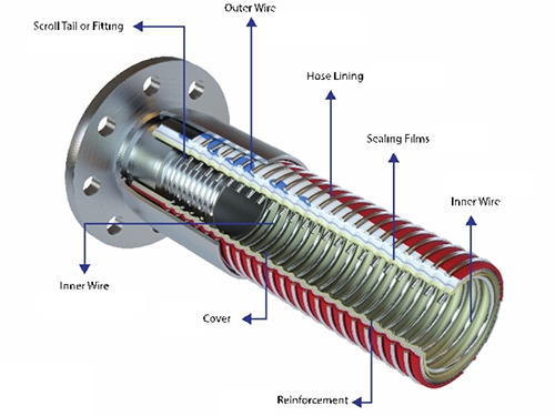 The hose body is composed of multi-layer functional polymer films and synthetic fiber fabric reinforcement layers, and the inner and outer two layers of spiral metal wires are tightly wound.